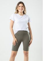 com cintura médio-alta. O cós elástico garante ajuste seguro