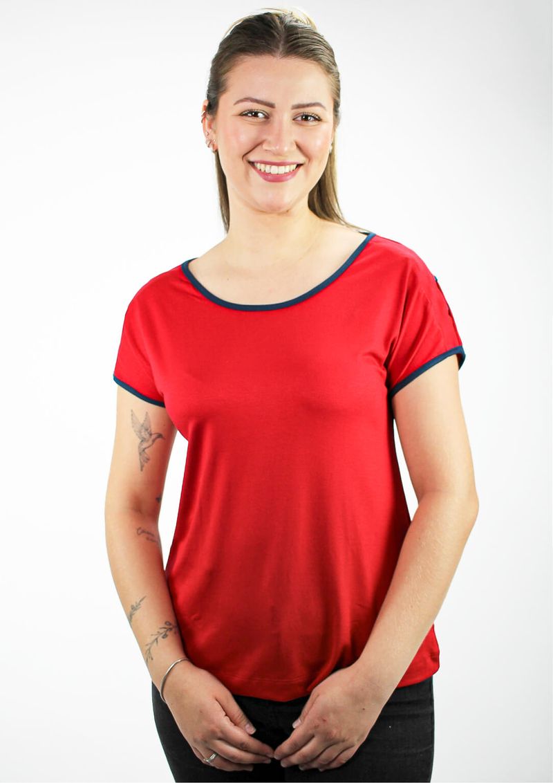 Possui todo acabamento de viés e detalhes nas mangas na cor Azul marinho.