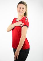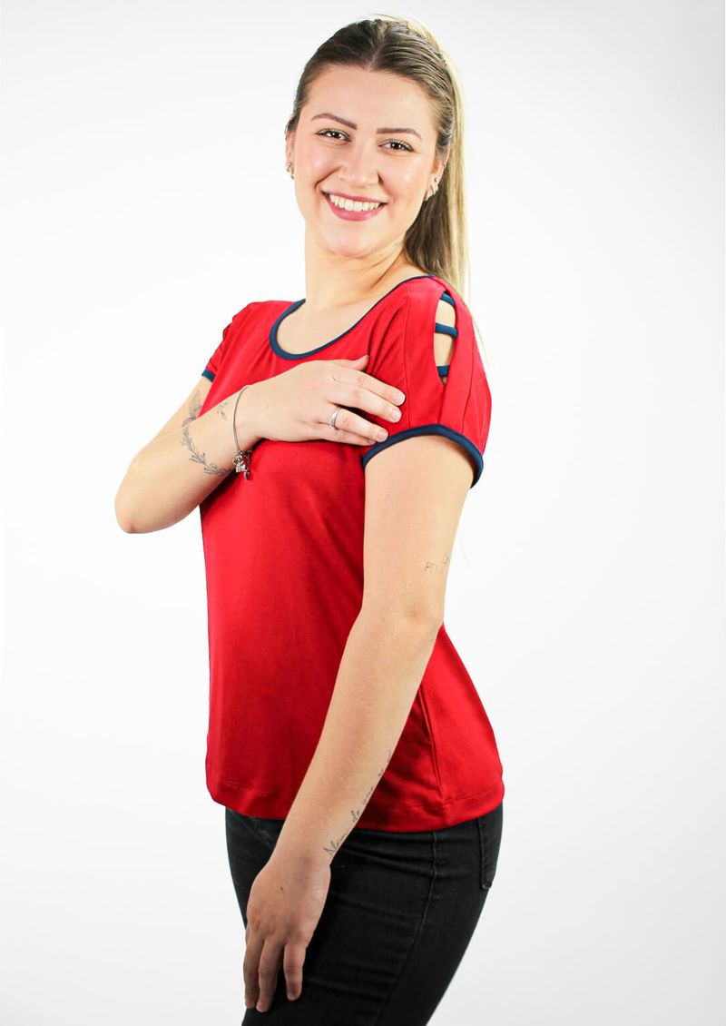 Mangas curtas, compostas por detalhe de abertura e pequenas "tiras"