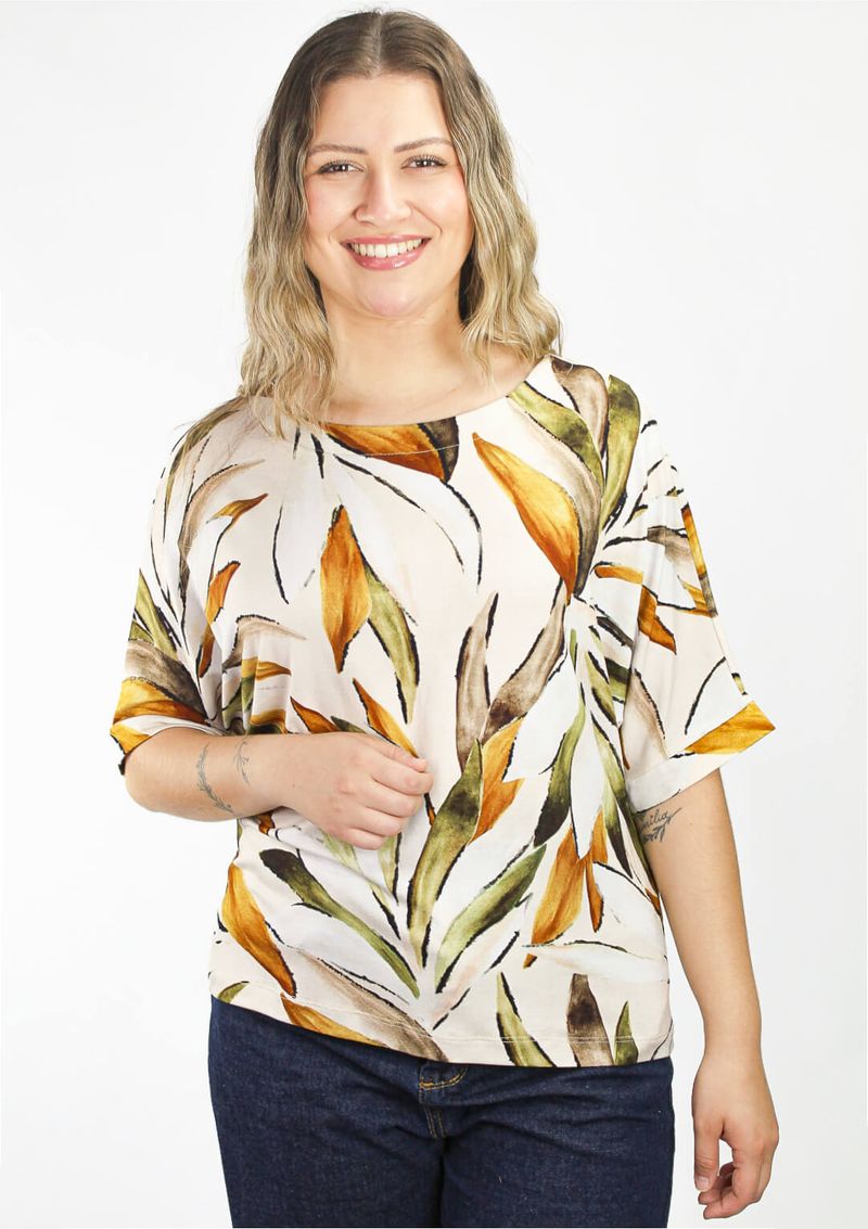 A blusa estampada é uma escolha perfeita para quem busca estilo e conforto em uma só peça. Com manga japonesa e decote redondo, essa blusa traz um visual moderno e fluido, ideal para diversas ocasiões. O punho na barra adiciona um toque de sofisticação e acabamento impecável. A estampa vibrante nas cores Verde, marrom e bege é um destaque, garantindo um visual único e elegante. Permita-se!