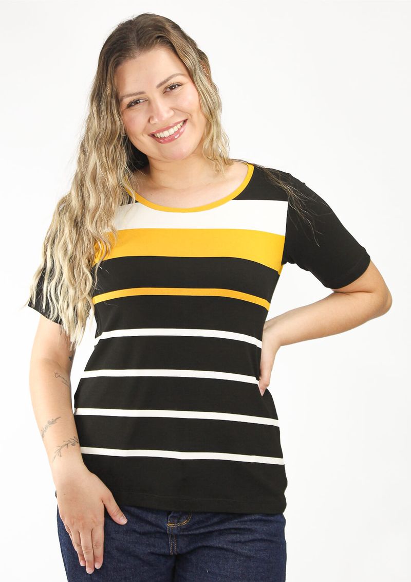 Blusa Listrada em Amarelo, Preto e Off White – Conforto e Estilo para o Seu Guarda-Roupa.