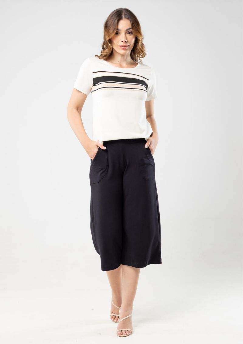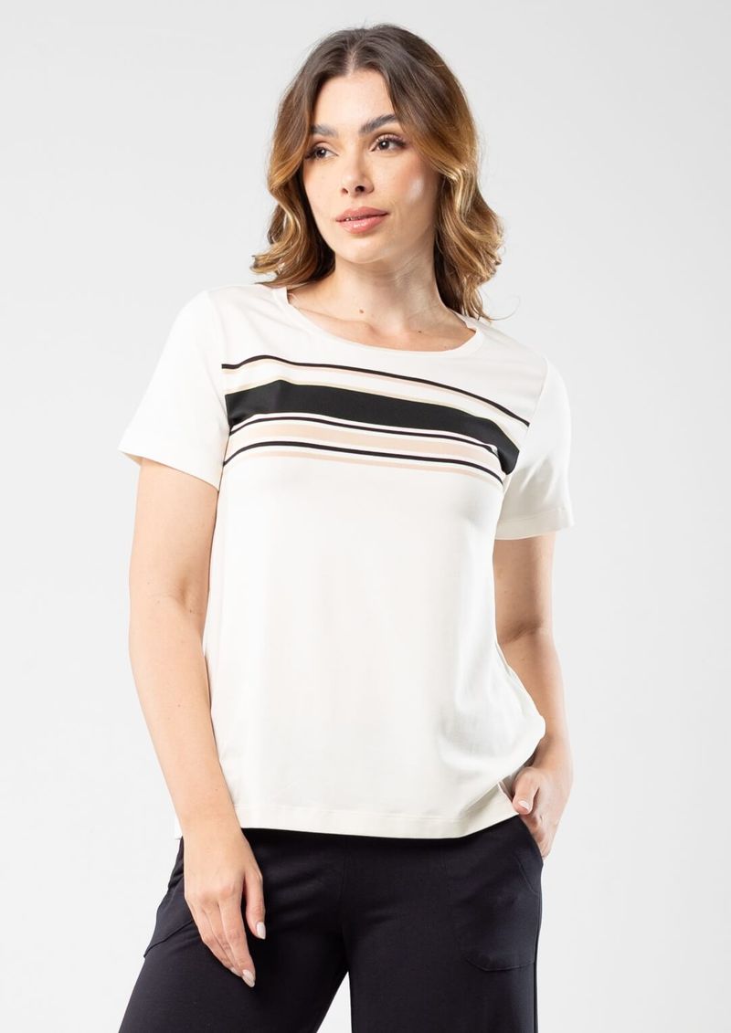 Atualize seu guarda-roupa com a blusa listrada nas sofisticadas combinações de Preto e Bege sobre um fundo Off white.