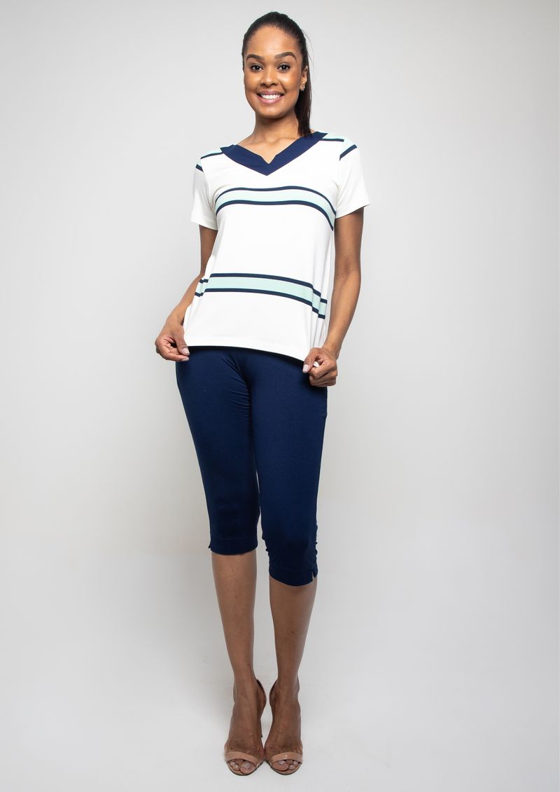 Blusa em malha listrada em tons de Azul Marinho e Verde, sobre o fundo Off White.