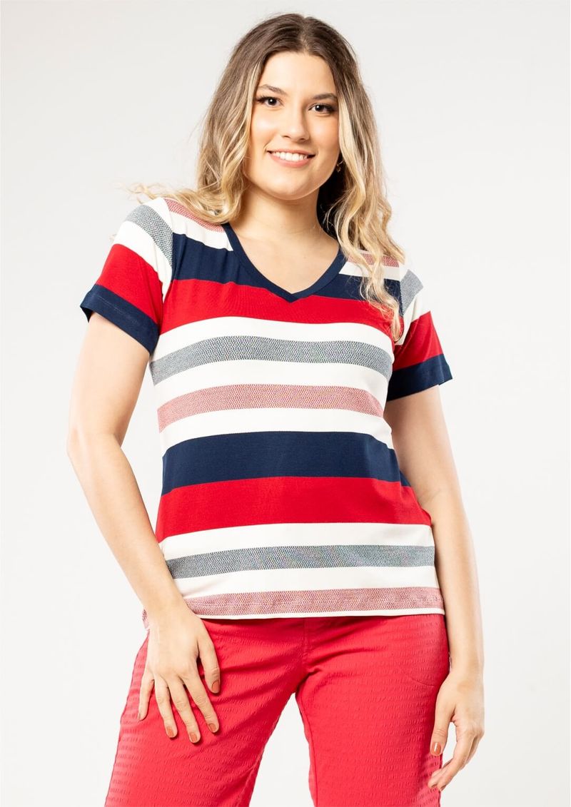 Blusa Listrada de Manga Curta com Decote V Azul Marinho, Vermelho e Off White | Conforto e Estilo em Viscocrepe.