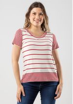 Com decote redondo, mangas curtas e malha listrada