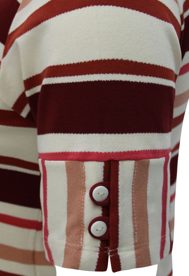 Malha da blusa listrada, em tons de vermelho e Off White.