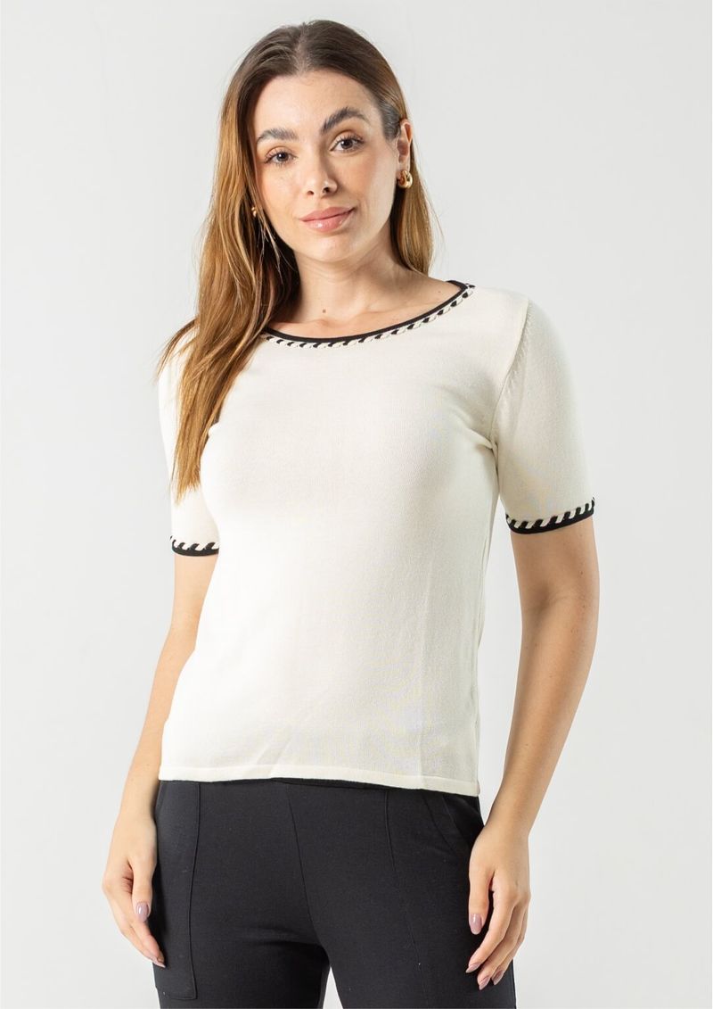 Possui decote redondo e detalhes diferenciados nas mangas e na gola,