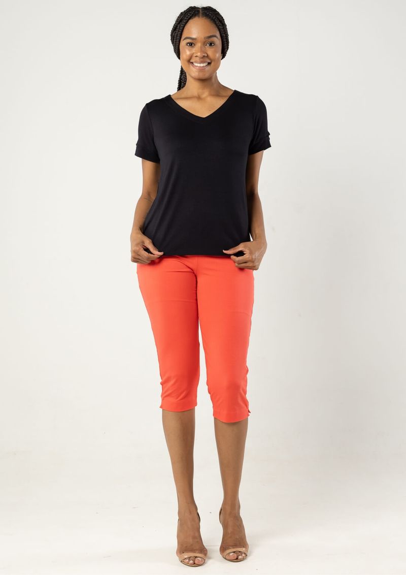 Calça básica, composta por dois bolsos traseiros, e falsos bolsos frontais.