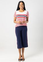 Calça pantacourt na cor Azul Marinho, com friso lateral na cor Vermelho.