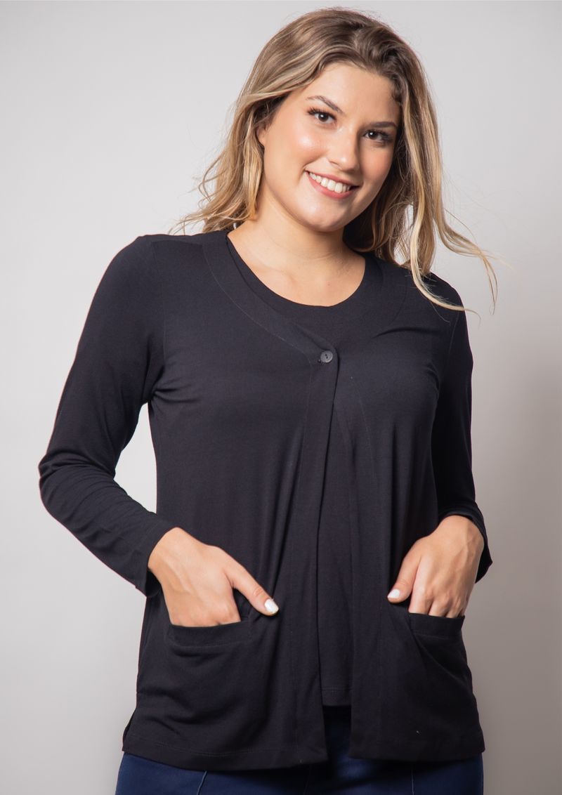 Possui 2 bolsos frontais. Modelagem soltinha ao corpo.