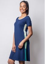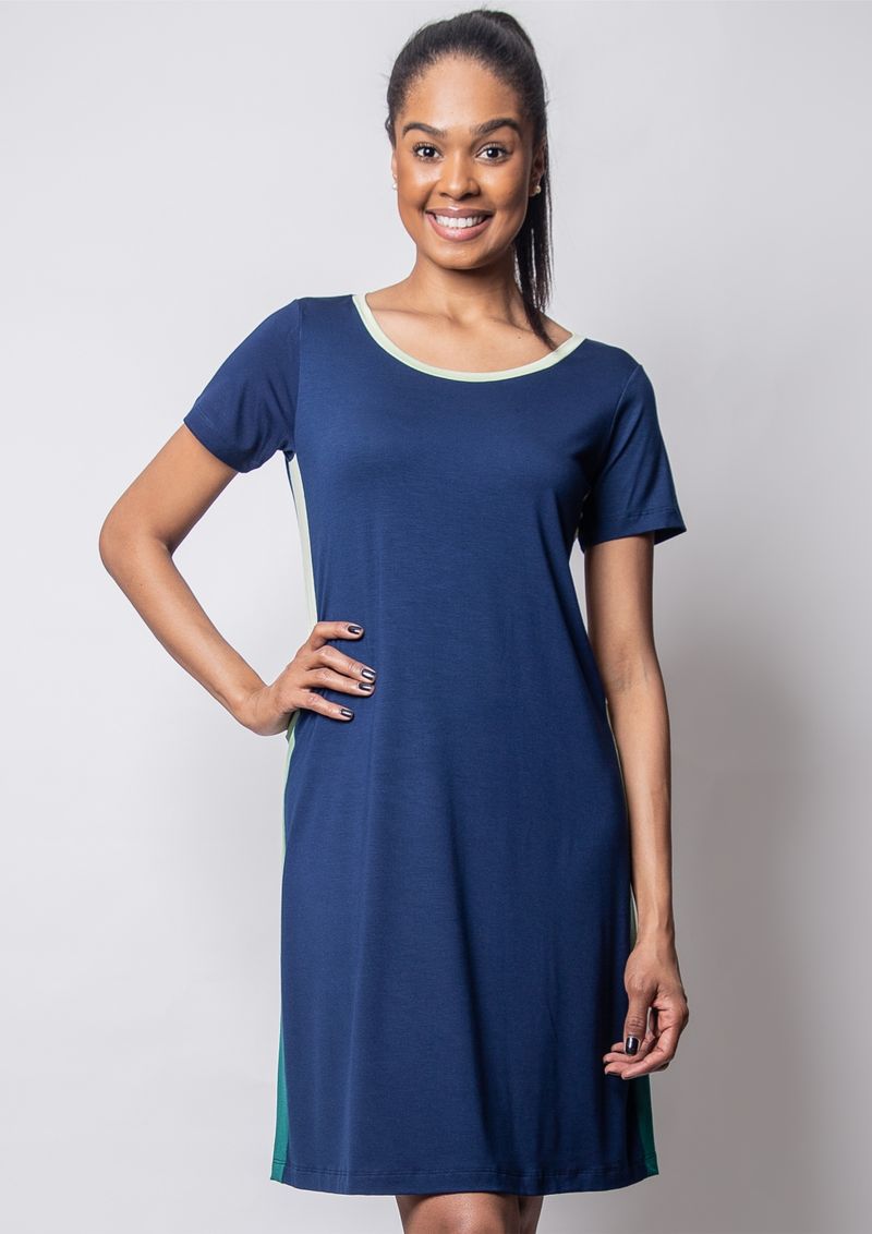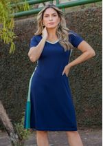 Vestido em malha na cor Azul Marinho, com recortes em tons de Verdes.