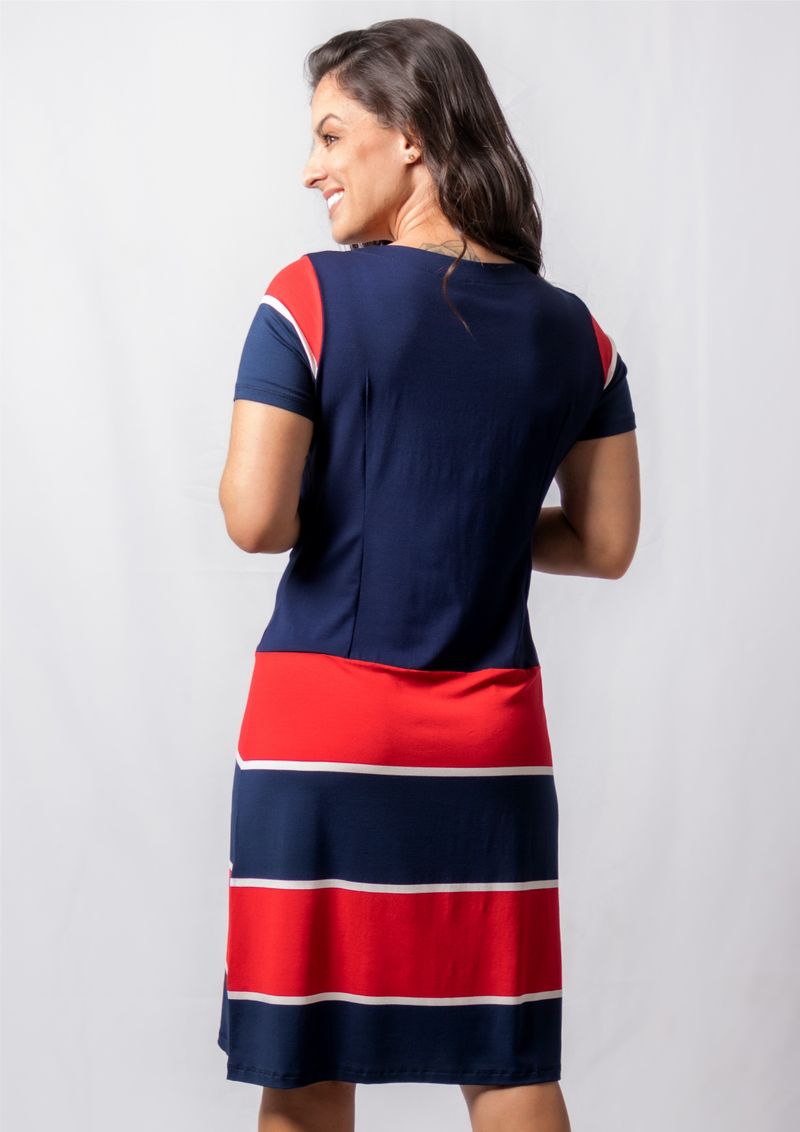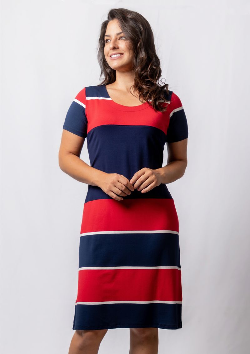 Malha listrada em Azul Marinho, Vermelho e Branco.