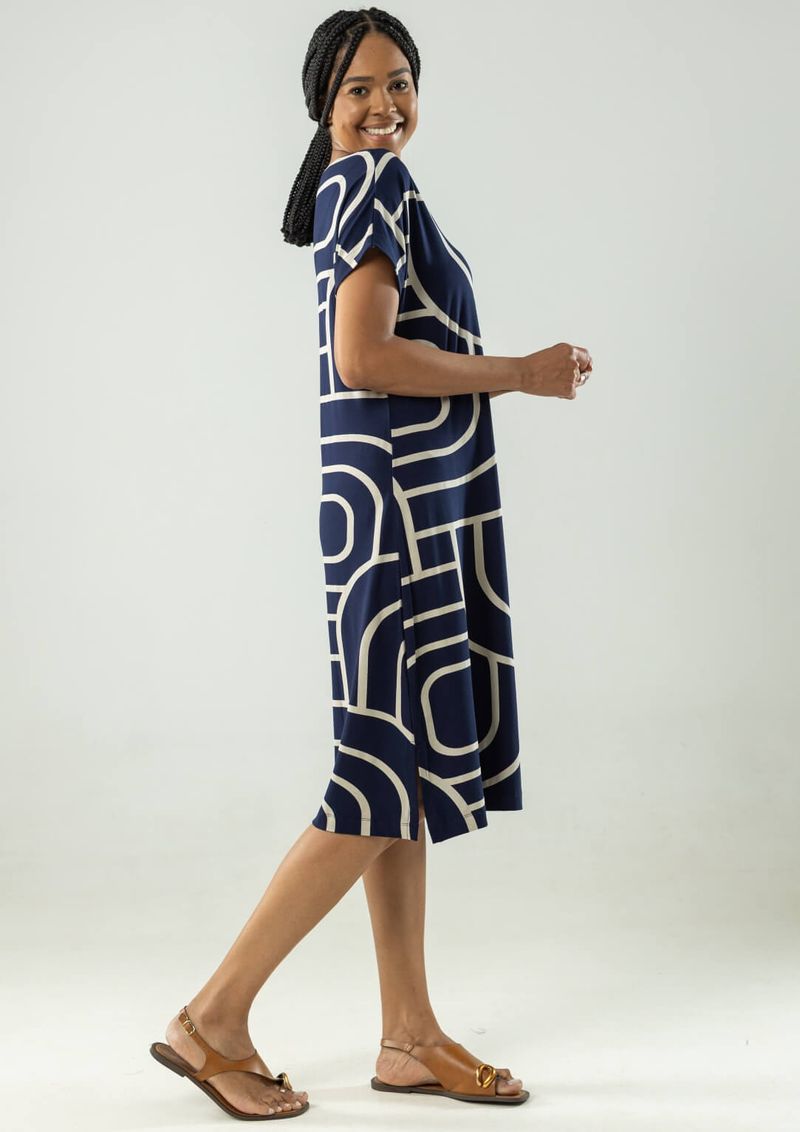 Encante-se com o Vestido Azul Marinho Estampado, uma peça que combina elegância e conforto em cada detalhe.