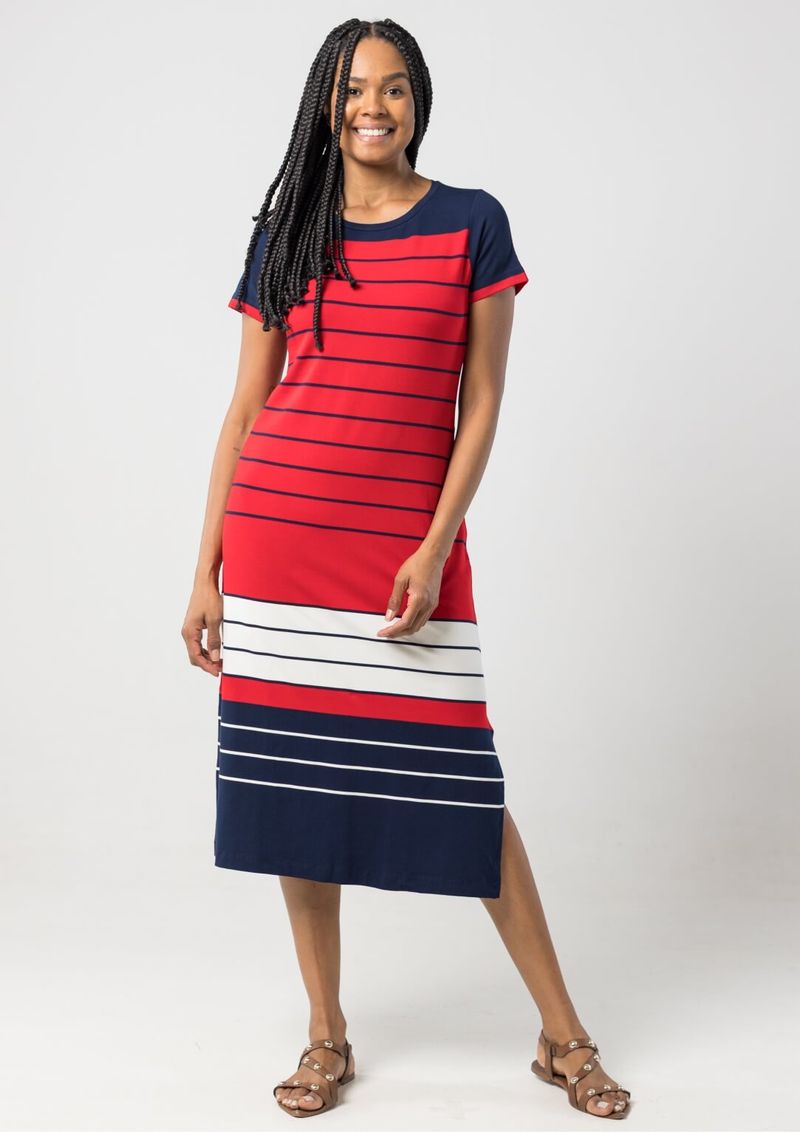 Vestido Midi com decote redondo e mangas curtas.