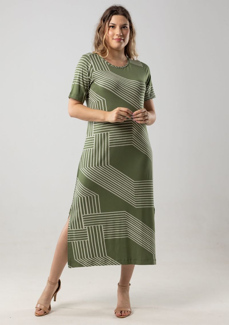 estampa contemporânea e mangas curtas. As fendas