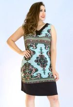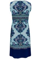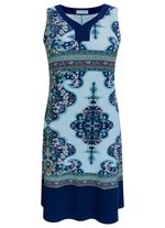 Vestido em malha estampada, composto por detalhe lisos em azul marinho.