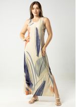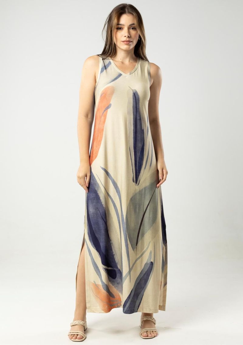 Vestido Regata estampado em tons de Bege, Coral, Azul Marinho e Preto.