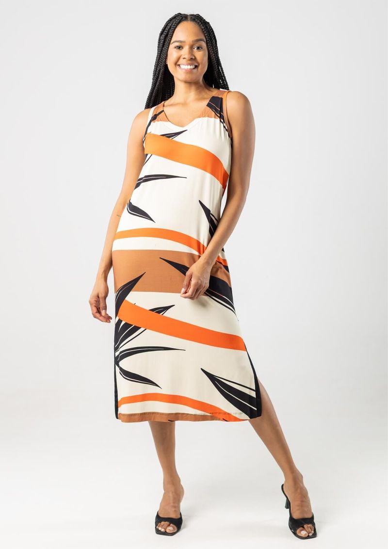 Vestido Midi Regata estampado em Tons de Laranja, Bege, Preto e Marrom.