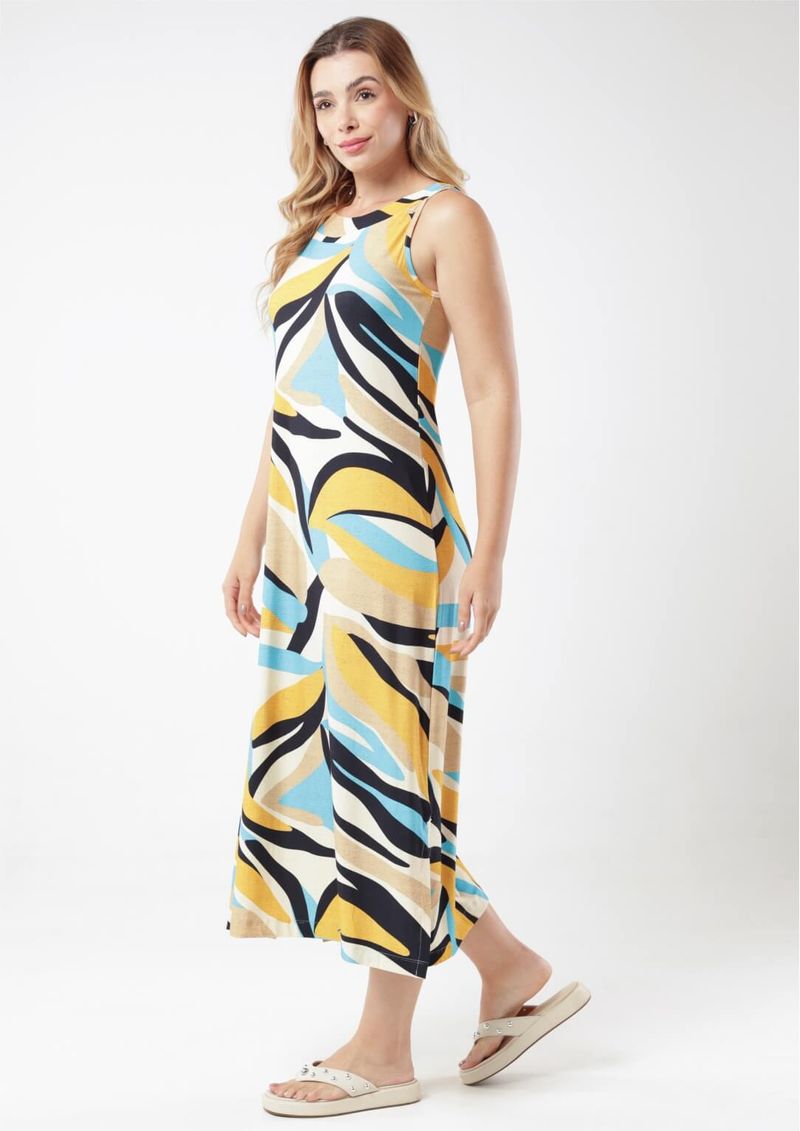 Vestido Regata estampado em tons de Mostarda, Bege, Azul e Azul Marinho – Conforto e Estilo.