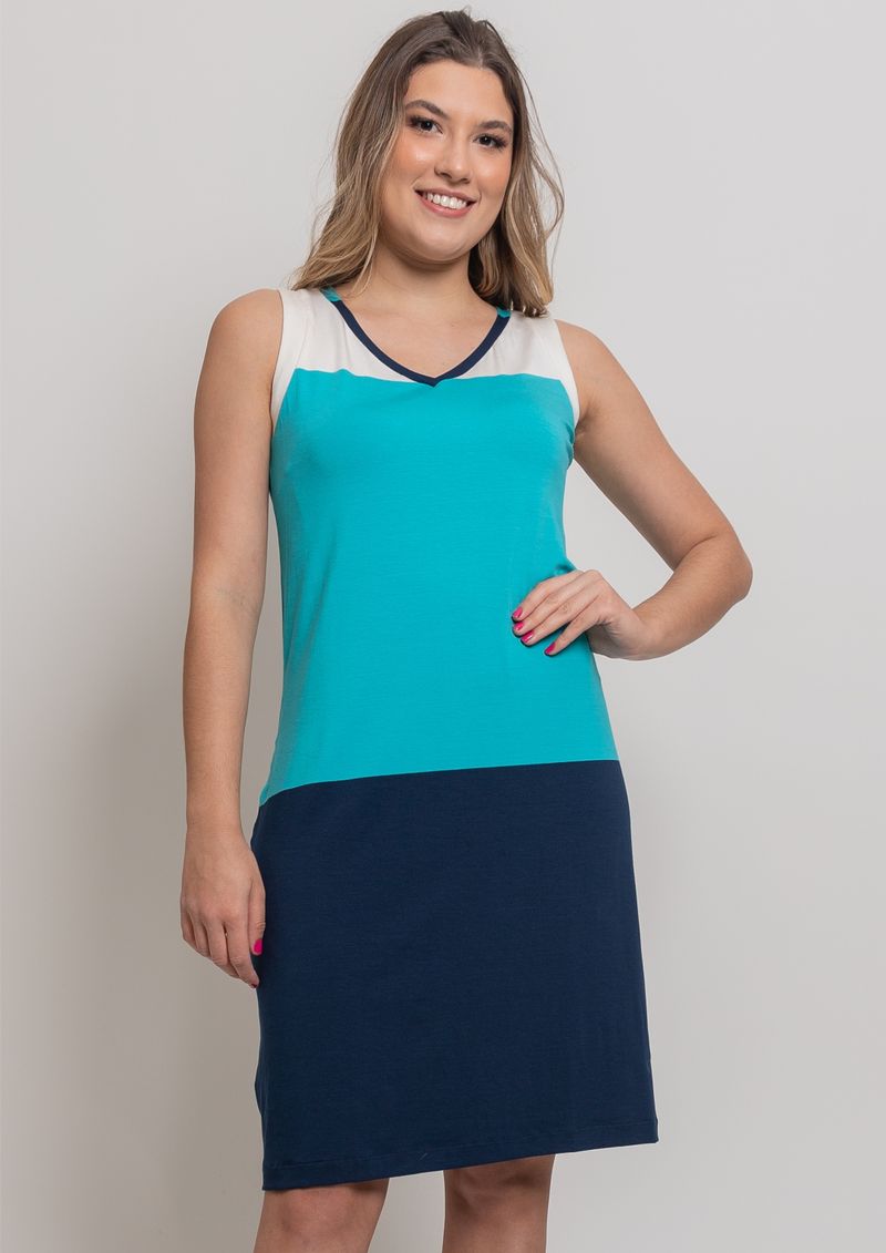 Vestido curto em malha listrada, em tons de Marinho, Off White e Azul.
