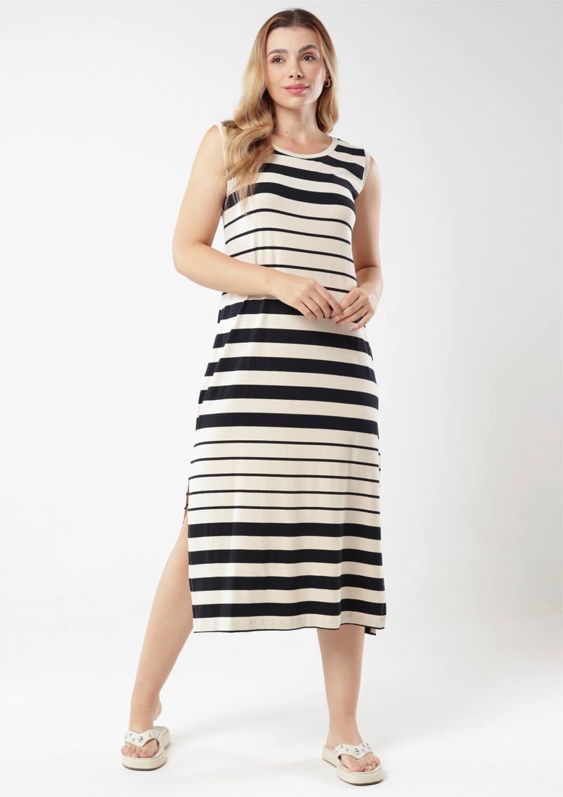 Vestido Regata Listrado na Cor Bege e Preto - Estilo e Conforto em Cada Detalhe.
