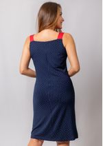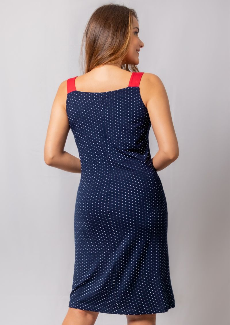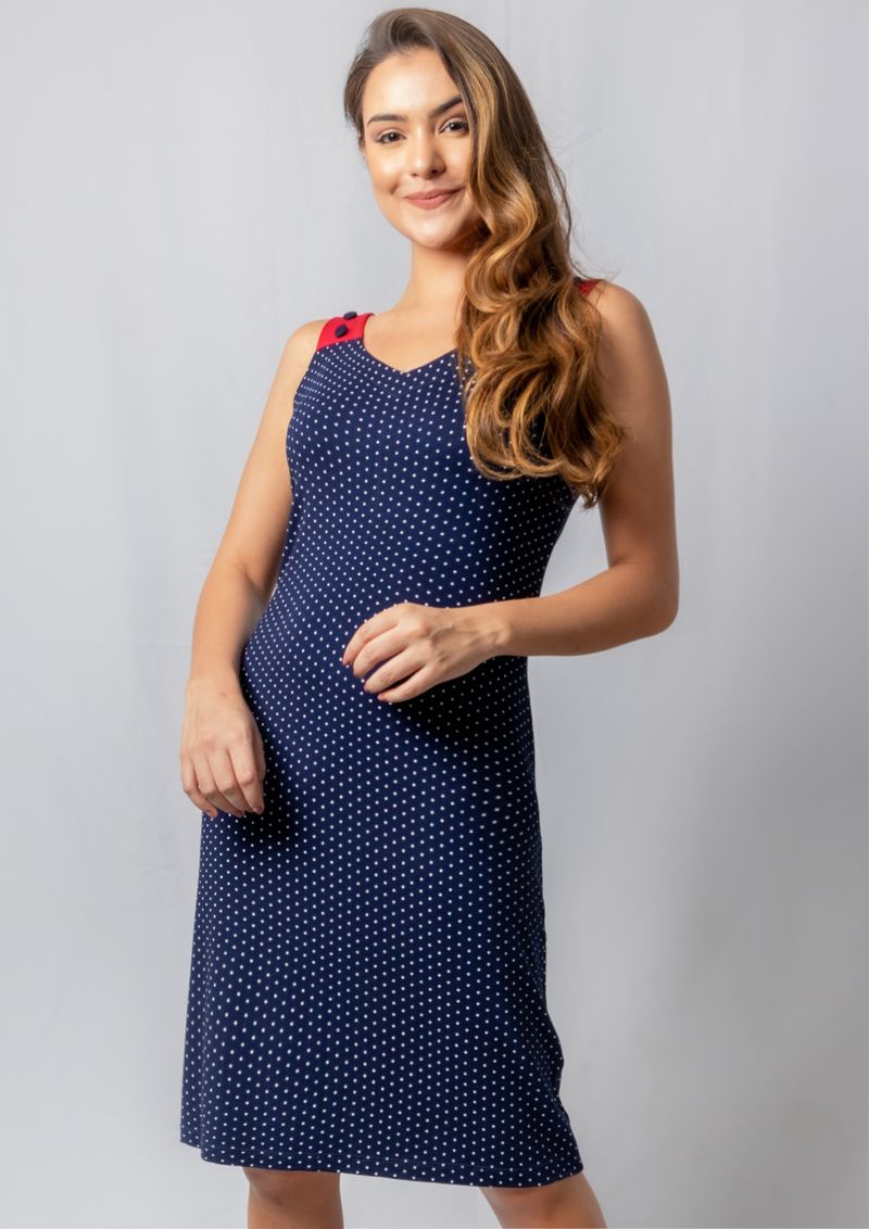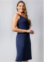 Vestido curto em malha de poá sobre o fundo Azul Marinho.